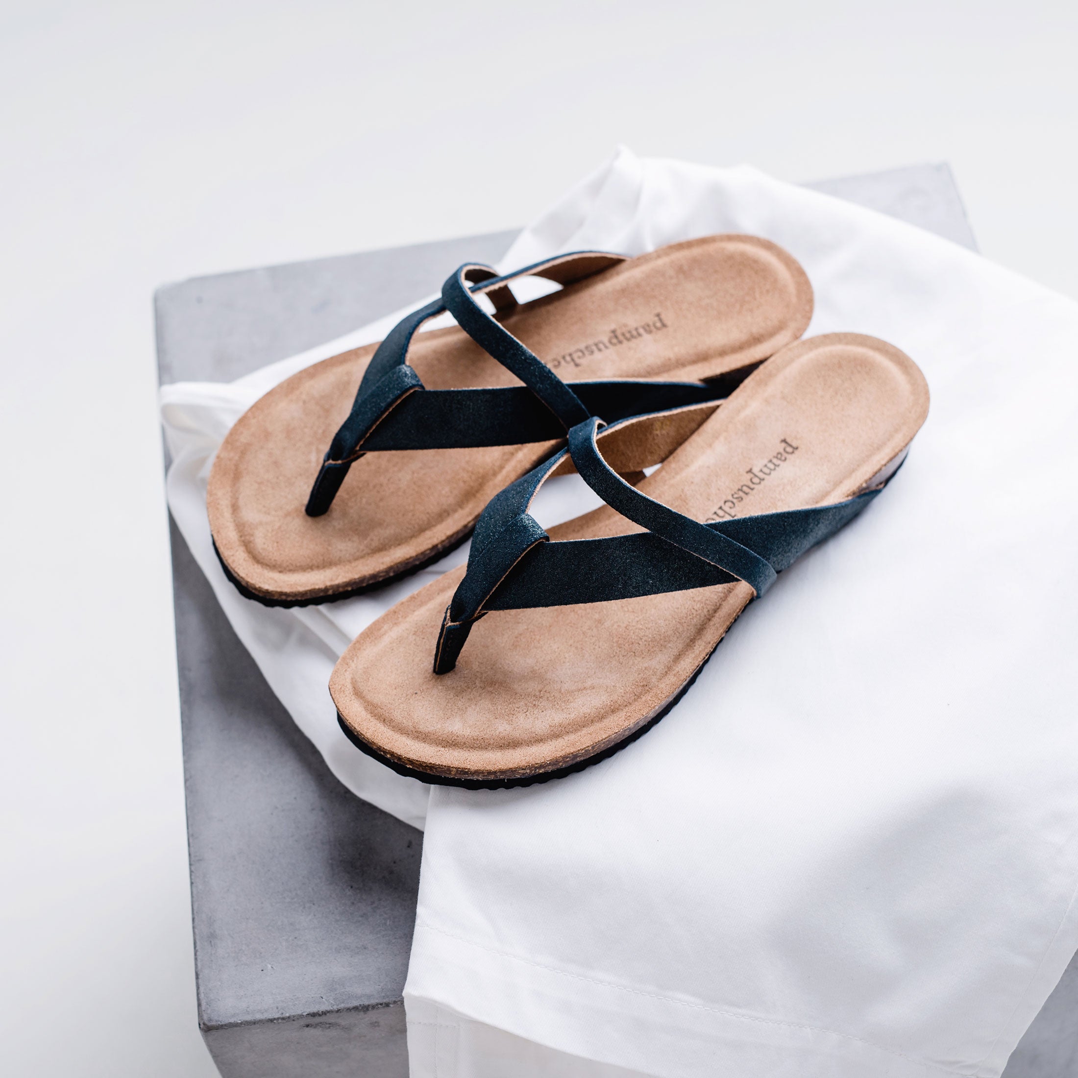 Der moderne Zehentrenner Eva hat eine biegsame Korksohle und eine fein gepolsterte Innensohle aus Rauleder.