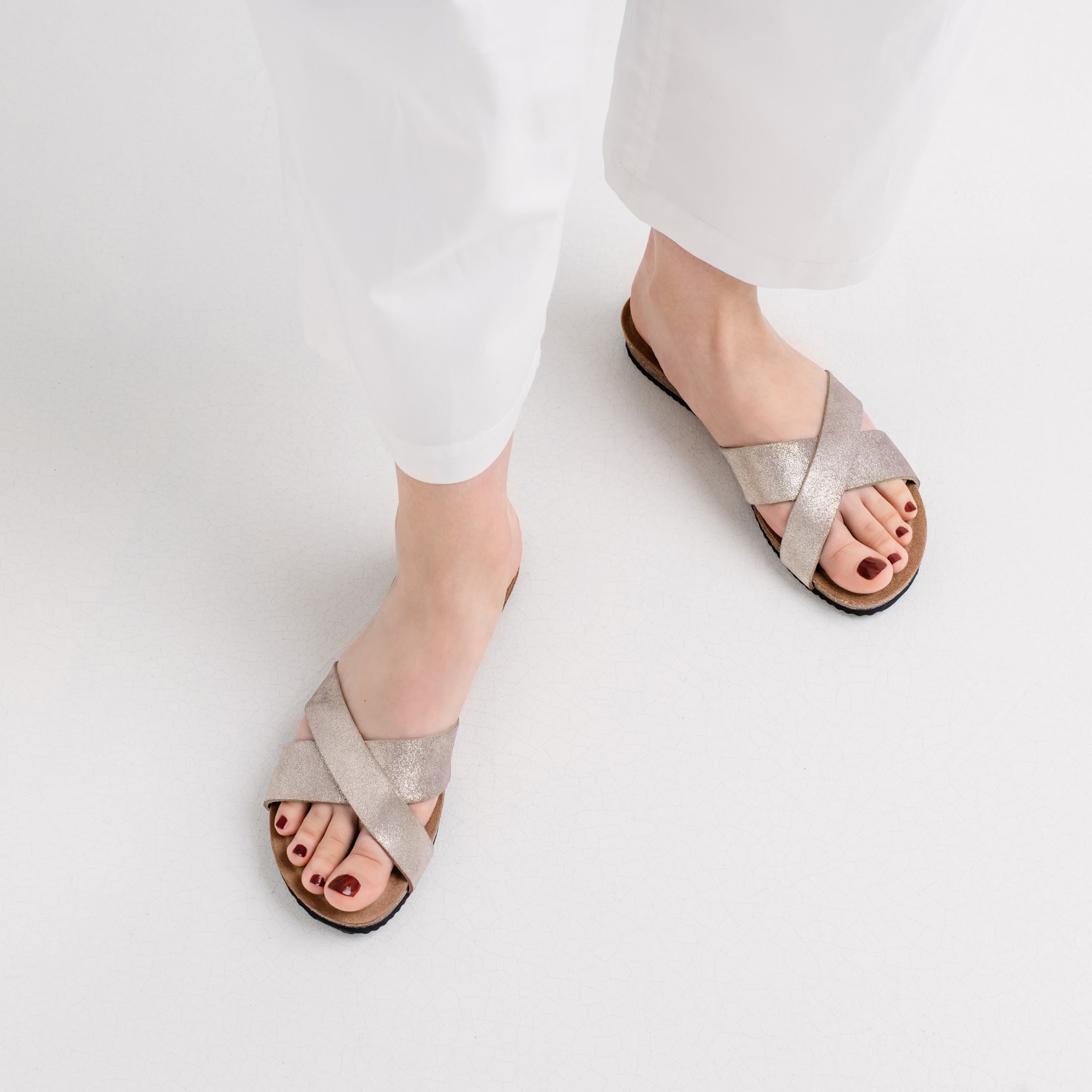 Lyda ist unser zeitlos schöner Sandalenklassiker, mit weichen überkreuzten Lederriemen. Die biegsame Korksohle ist mit fein gepolstertem Rauleder ausgeschlagen. Durch das metallisch glitzernde Oberleder wird aus dem schlichten Modell ein echter Hingucker.