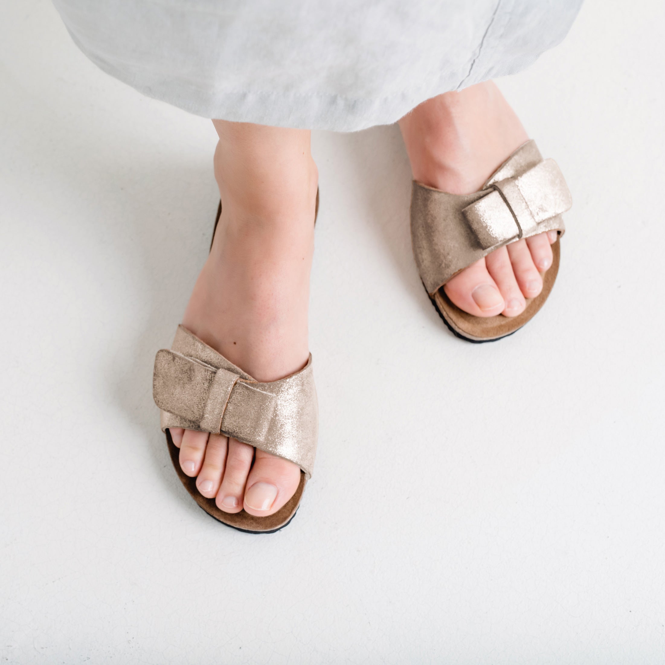 Die mit einem gut versteckten Klettverschluss für fast jede Fussbreite verstellbare Sandale Vera ist mit einer sehr dekorativen, asymmetrischen Schleife geschmückt. Die Innensohle aus Rauleder ist fein gepolstert, die Sohle aus biegsamem Kork. Das glitzernde Metallicleder verleiht dem Modell einen besonderen Flair.
