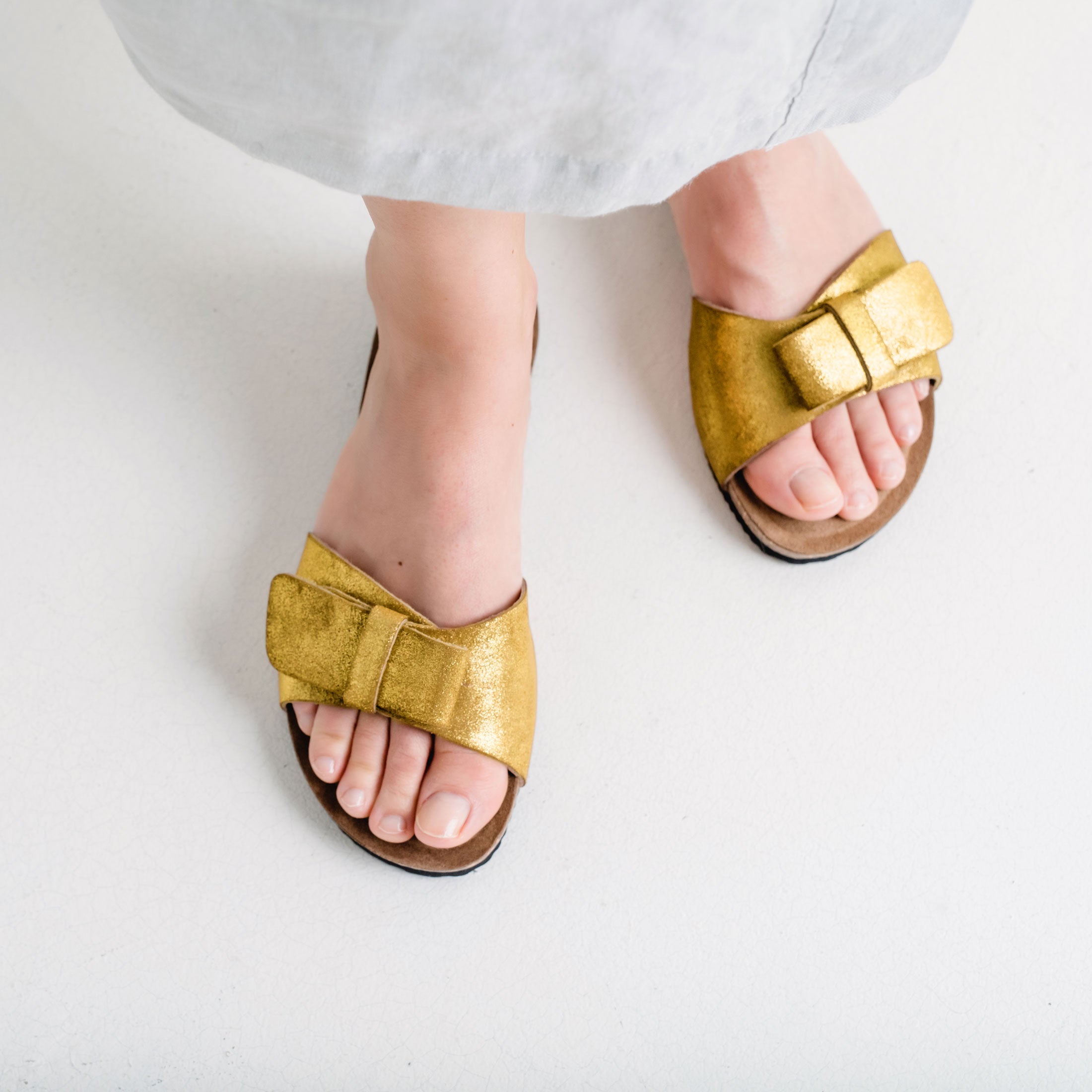 Die mit einem gut versteckten Klettverschluss für fast jede Fussbreite verstellbare Sandale Vera ist mit einer sehr dekorativen, asymmetrischen Schleife geschmückt. Die Innensohle aus Rauleder ist fein gepolstert, die Sohle aus biegsamem Kork. Das glitzernde Metallicleder verleiht dem Modell einen besonderen Flair.
